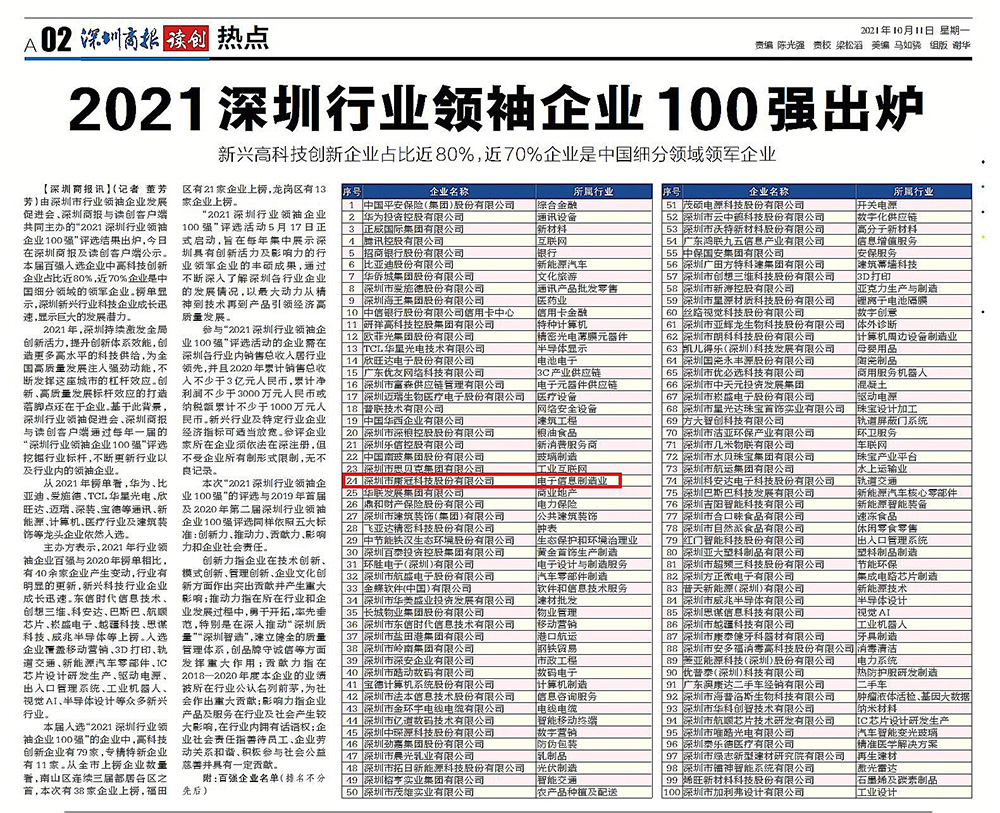 L'activité de sélection des « 100 meilleurs leaders de l'industrie de Shenzhen en 2021 » vise à se concentrer sur l'affichage des résultats fructueux des leaders de l'industrie innovants et influents de Shenzhen, afin de diriger le développement de haute qualité de l'économie avec la plus grande impulsion. Les entreprises sélectionnées doivent non seulement atteindre des objectifs ambitieux en termes de chiffre d'affaires total et de bénéfice net en 2020, mais également présenter des avantages exceptionnels en termes d'innovation, de force motrice, de contribution, d'influence et de responsabilité sociale d'entreprise.