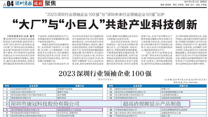 Récemment, les résultats des « 100 Meilleurs leaders de l’industrie de Shenzhen en 2023 » et des « 50 Meilleurs leaders futurs de l’industrie de Shenzhen » coparrainés par l’Association de promotion du développement des entreprises des leaders de l’industrie de Shenzhen et le Shenzhen Business Daily/Reading and Innovation ont été publiés. Avec la forte dynamique accumulée dans la fabrication de produits d’affichage vidéo ultra-haute définition, KTC a une fois de plus eu l’honneur de figurer parmi les 100 Meilleurs leaders de l’industrie à Shenzhen.