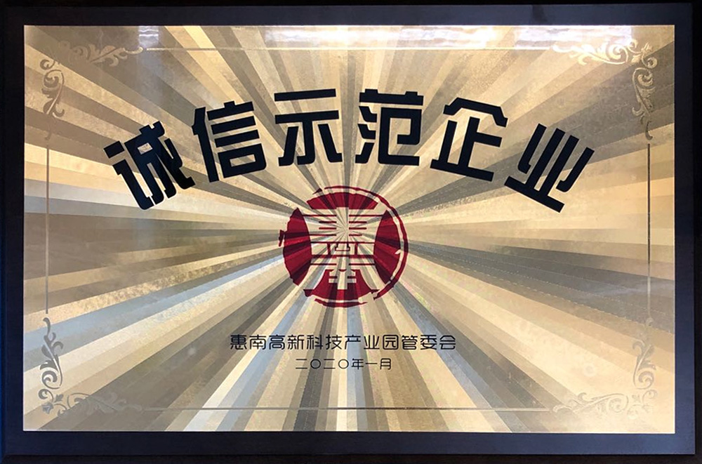 今年1月,惠南高科技产业园管委会在启动仪式上签署了第一批试运行企业信用“承诺函”的科技企业中,对重质量、讲诚信方面表现优秀的企业进行公布,并进行荣誉授牌。惠州mk体育有限公司荣列其中,被授予了“城市示范企业”这一荣誉称号。