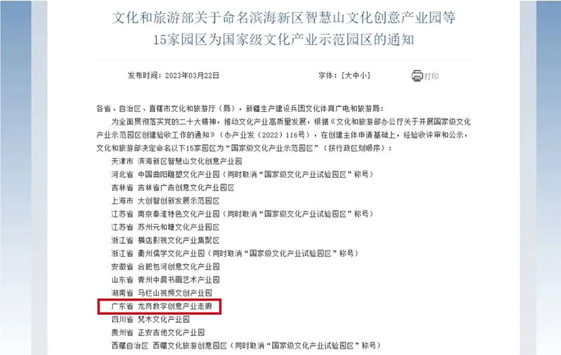 3月28日,龙岗数字创意产业走廊被国家文化和旅游部评为“国家级文化产业示范园区”,这项“国字号”荣誉,是深圳市首个通过创建验收的“国家级文化产业示范园区”。