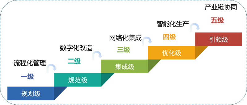 智能制造能力成熟度模型从低到高分五个成熟度等级综合评价企业数字化、网络化、智能化发展水平,目前国内企业智能制造能力最高为四级水平。