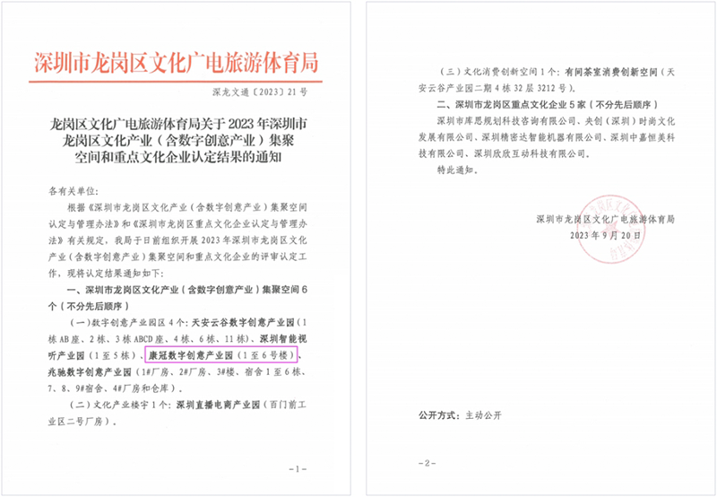 近期,深圳市龙岗区文化广电旅游体育局组织开展了2023年深圳市龙岗区文化产业(含数字创意产业)集聚空间和重点文化企业的评审认定工作,其中mk体育数字创意产业园荣获“龙岗区数字创意产业园区”认定。