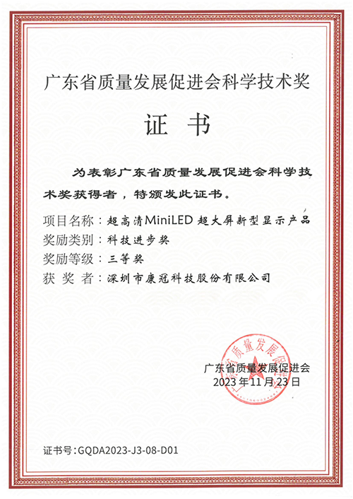 近日,2023年度广东省质量发展促进会科学技术奖获奖名单正式发布,mk体育研发的“超高清MiniLED超大屏新型显示产品”在超高清显示领域取得突破性成果,喜获广东省质量发展促进会“科技进步奖三等奖”。