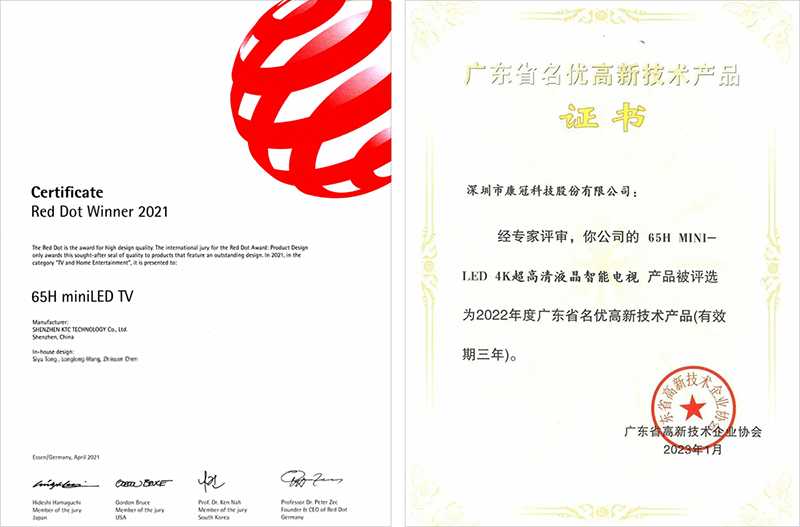 作为率先量产MiniLED电视产品,65H电视具有较强的先发优势,不仅在市场反馈良好,而且还获得诸多荣誉。65H电视荣获“德国红点产品设计奖”、“广东省名优高新技术产品”。此外,2022年通过由深圳工业总会具体组织,13个政府部门、58家行业协会共同开展的第二十一届“深圳企业创新纪录”审定。
